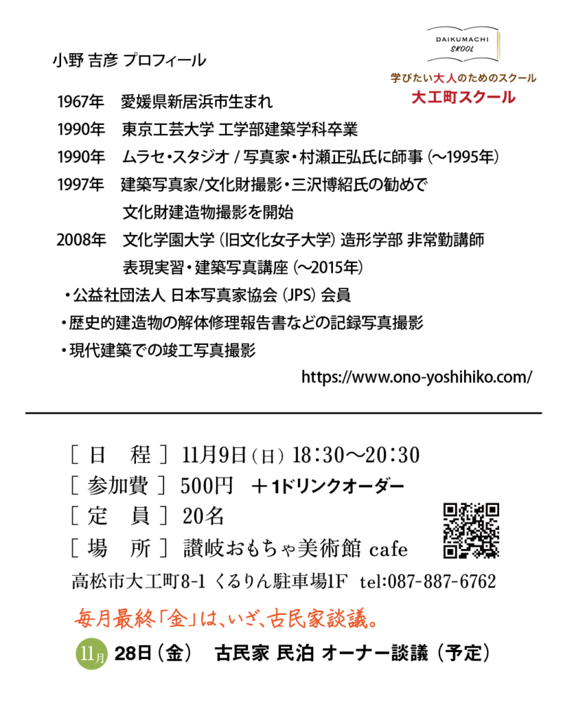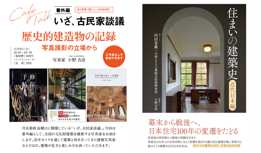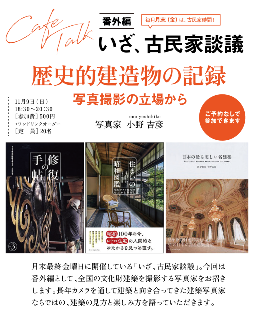 月末最終金曜日に開催している「いざ、古民家談議」。今回は番外編として、全国の文化財建築を撮影する写真家をお招きします。長年カメラを通して建築と向き合ってきた建築写真家ならではの、建築の見方と楽しみ方を語っていただきます。