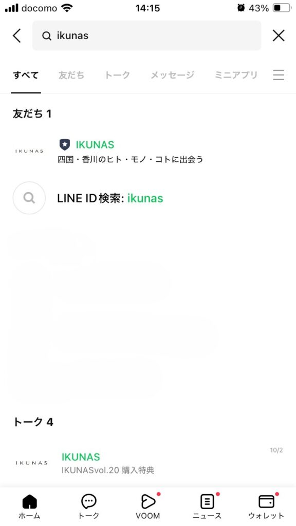- LINE「ホーム」画面で「ikunas」と検索