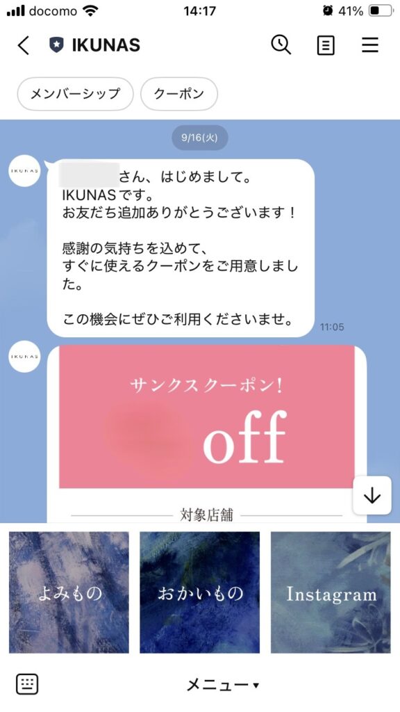 - IKUNASの運営する各店舗でお得なサービスを受けられる!(メンバーのみに配信します)