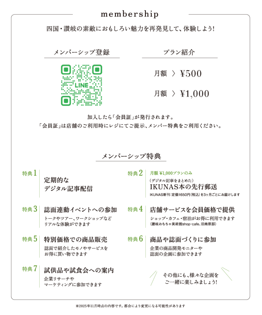 | ¥1,000 プラン | 雑誌IKUNAS(季刊誌:販売価格1,650円)が手元に届く ーーー以下、¥500プランと同じ内容 メンバー限定公開の取材記事が読めるサイトページのアクセス権 ショップやカフェが、メンバー特典でご利用できる 交流会やイベントのメンバー特典で参加できる |