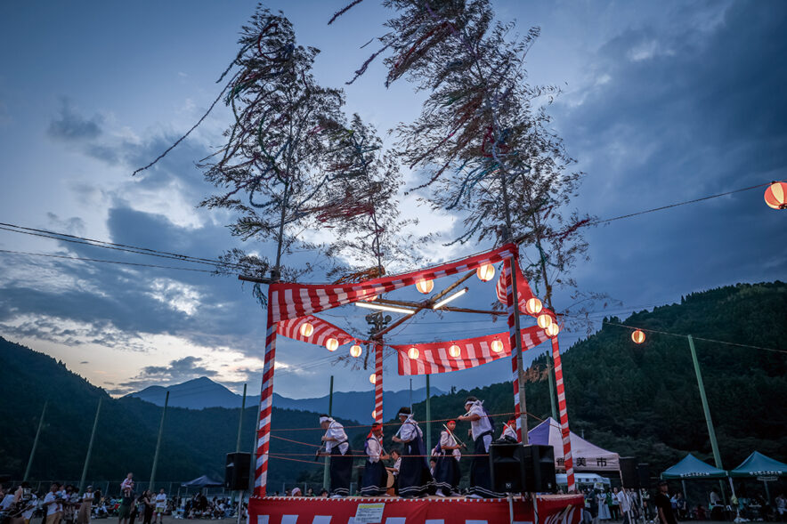 日が落ちる頃、舞台に上がってきたのは、襷掛けした勇壮な男たち。両手には日本刀を携えている。織り重なる山の向こうに太陽はとっくに沈み、強烈な湿気を帯びた高知の空に、群青の夜空が覆い被さってくる。先祖が還ってくるというお盆の時期も相まって、太刀踊りの周囲はあの世とこの世の狭間にいるような不思議な空間に包まれていた。