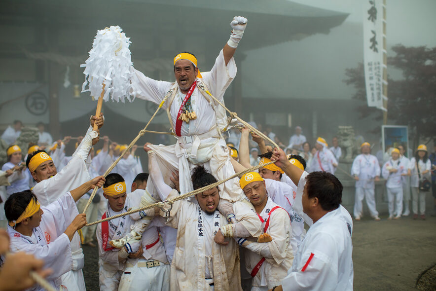 山開きの間、山頂に祀られるのが、全国で唯一直接触れられる御神体と言われる三体の神像。山頂に運ばれた像が、再び下ろされて来る神事は特に強烈だ。像を背負った者を皆で担ぎ上げ、何度も社殿の中に収めようとするが、ロープに引っ張られすんなりとは入らない。まるで神様が家に帰るのを嫌がって駄々をこねているよう。集中する人の意識が、よりこの山の聖性を高めてゆく。そう、石鎚という誇り高い名と共に。