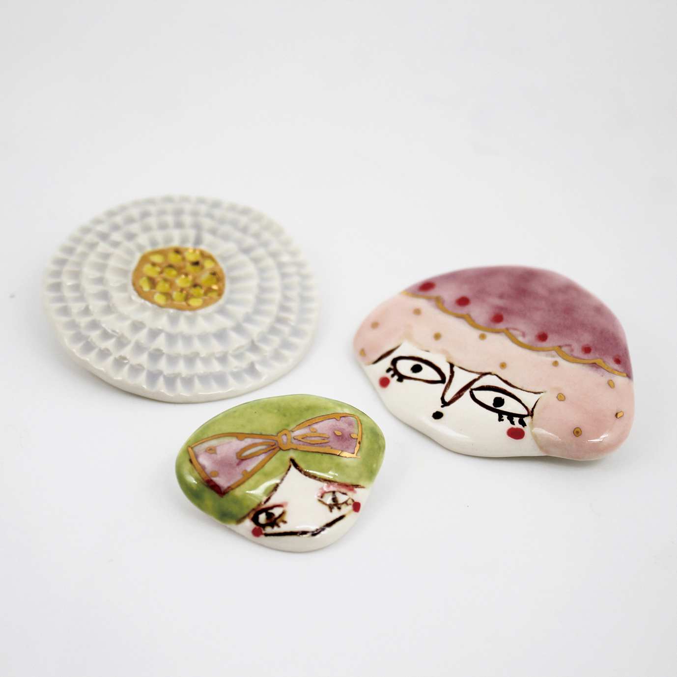 クラフト作家saiminさん作の、ユニークな陶器のブローチたち。焼き上げた粘土の温かな質感で空想の花や女の子を表現します。胸元に添えるだけで心和む気持ちになれるアクセサリーです。