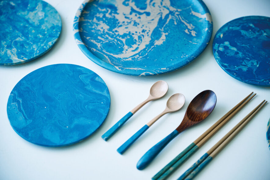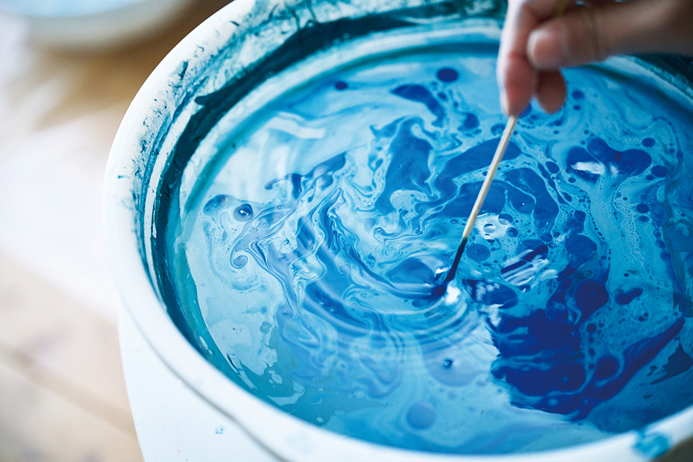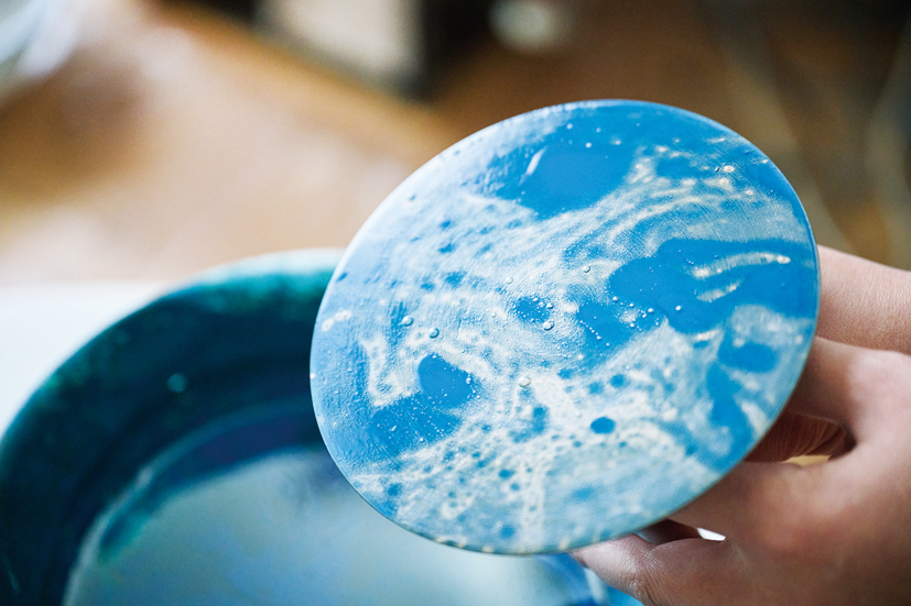 墨流しに使うのは、青色の顔料と透き漆を混ぜたオリジナルの色漆。それを水の中へ落とすと、青がふわりと広がります。軽く水面を混ぜ合わせたあと、ゆっくりと器を沈めていきます。そうして生まれる模様は、どれも違った表情を見せます。「作業は同じだけれど、模様は毎回違うので、そこが面白い」と話す竹森さん。ですが、自分のコントロールが及ばない分難しく、やり直すこともあるとか。