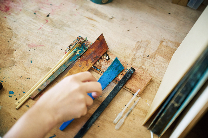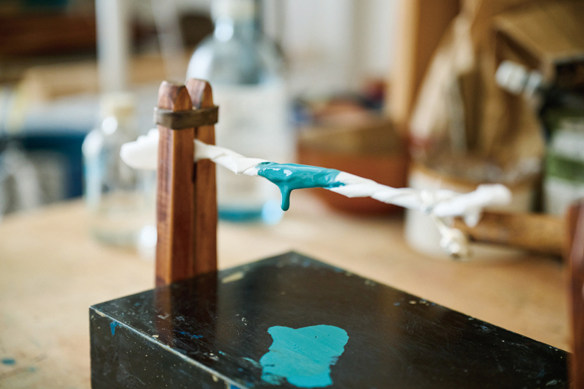 ヘラを使って塗ることも。使い込まれた筆の毛先は、青く染まる