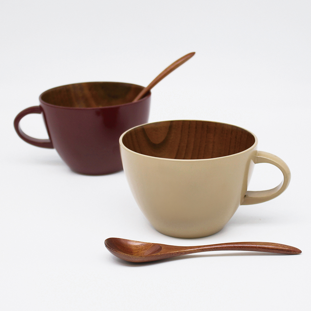漆のカップと木のスプーンのセット。大きめのサイズなので、シチューやスープ、カフェオレボウルとしてもお使いいただけます。結婚祝いなどに、セットでのギフト包装も承ります。
