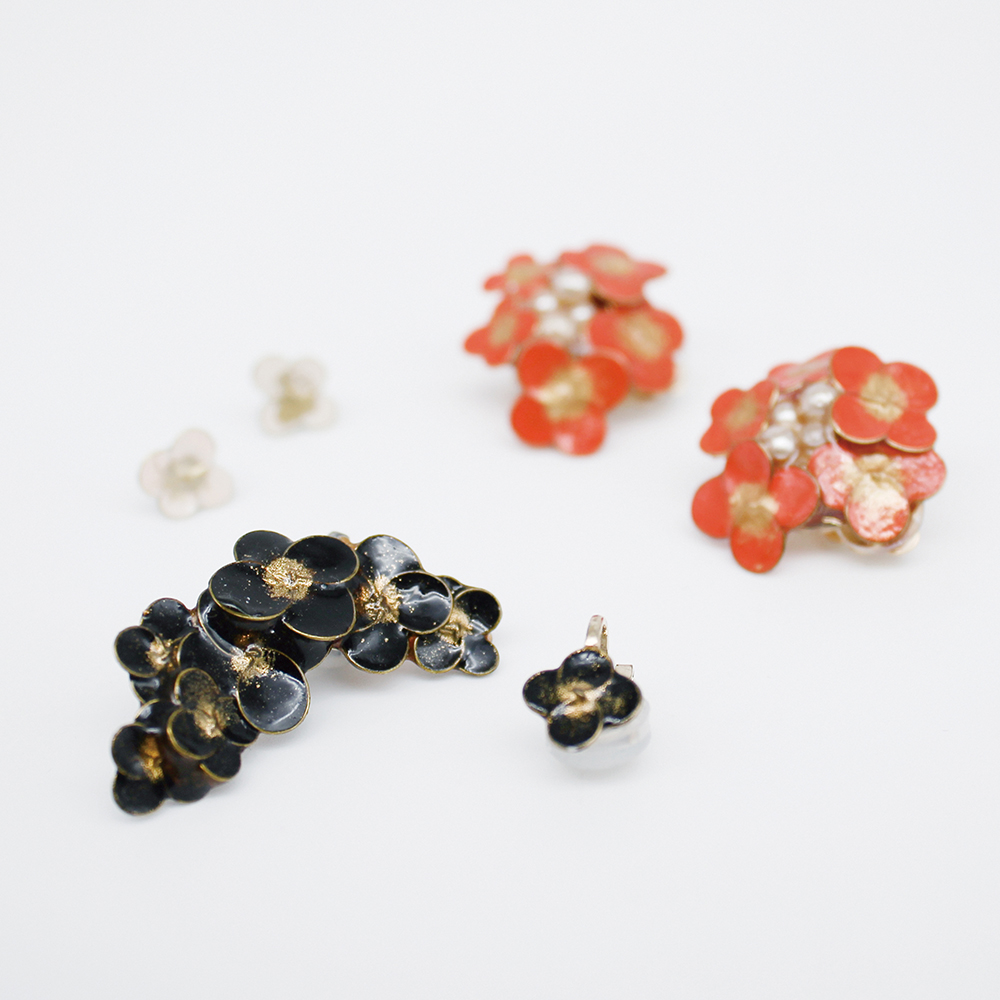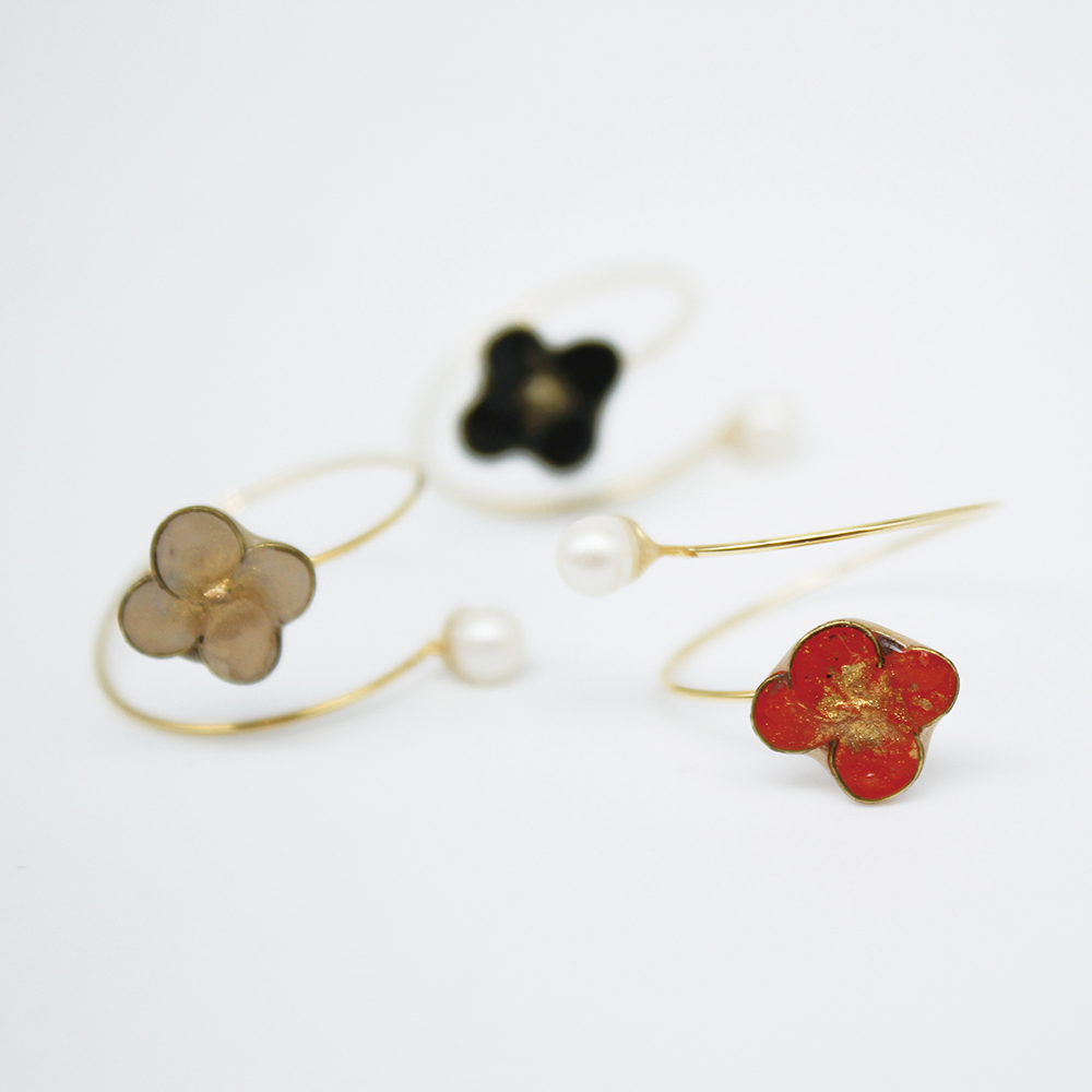 漆芸作家であり修復士としても活躍する、漆原さんが手がける漆のアクセサリー。小さなお花のモチーフには、丁寧に施された技術が宿っています。漆ならではの深い艶と温もりが、身にまとう人の魅力を引き立ててくれます。