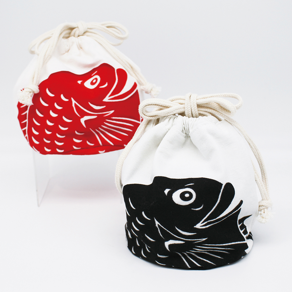 讃岐のり染の技法で染められた鯛のどアップが楽しい巾着袋。紐が長いので肩にかけても、背中に背負うこともできます。ファッションのアクセントに。