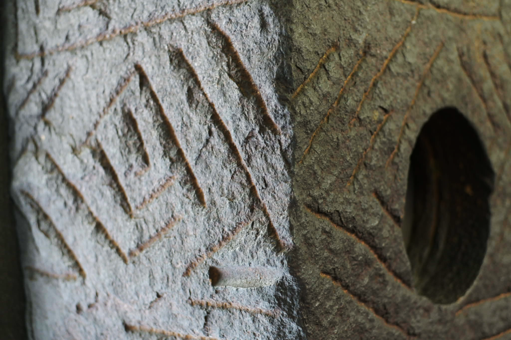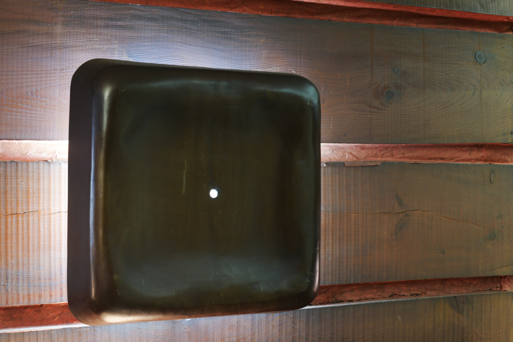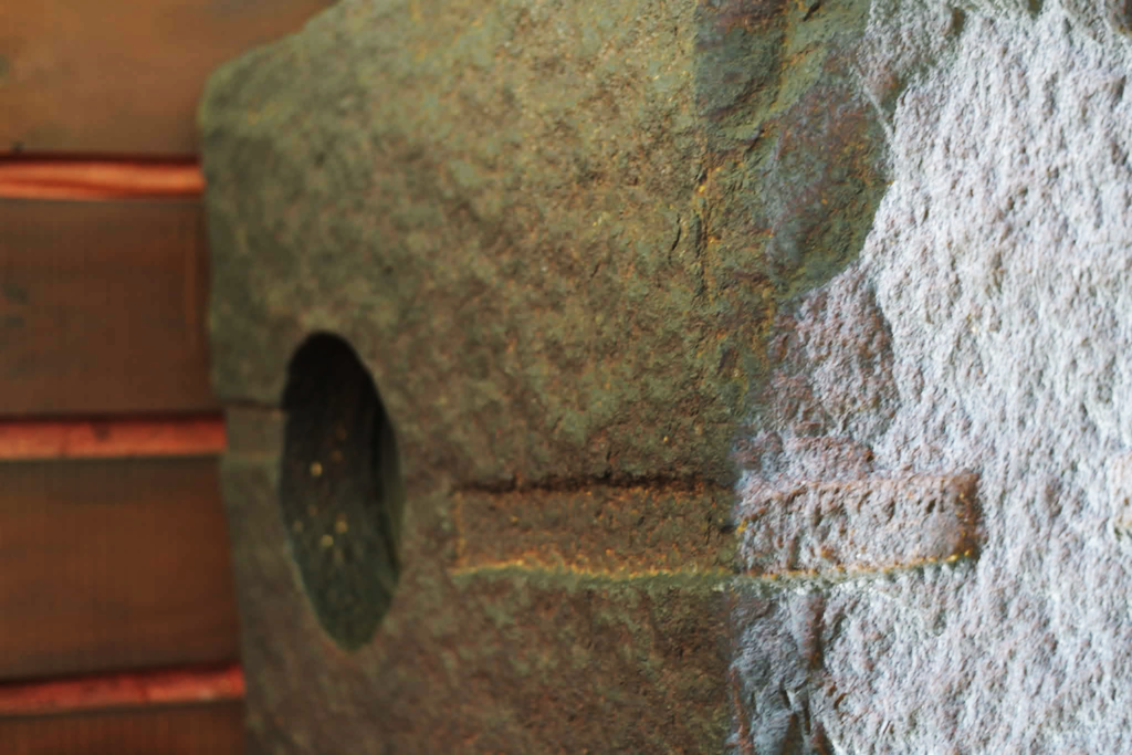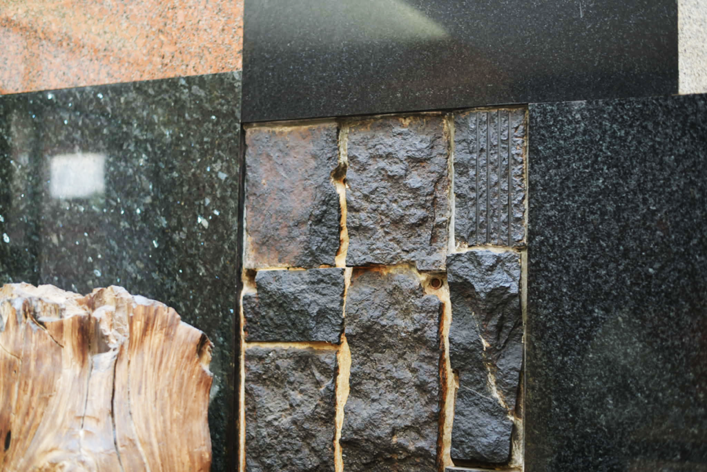 北面の前川國男が設計した万国博覧会日本館のために試作された壁面も、石彫は流政之がデザインし、地元の岡田石材工業で加工されたものである。この石材は、島根県松江市の大根島石(玄武岩)が用いられているが、約20万年前の火山活動でできた溶岩であり、独特の力強い質感を持つ。店に据えつける前には、加工場の近くの浜辺に石を並べ、飛行機を飛ばし、空から全体のバランスを確認していたそうだ。なんともスケールの大きな、この時代らしいエピソードを持つ。