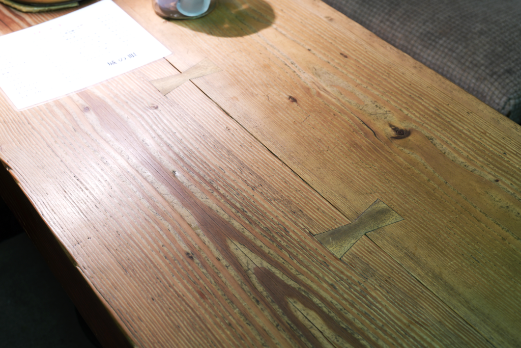 店内東面には中讃の方から伐り出されたと聞く松の板材が帯鋸で挽かれた加工痕が残るままの仕上げで横一文字に大胆に取り付けられ、北面の石壁とは大きく雰囲気の異なる仕上げとなっている。この木板の壁面には、瓦用の土を焼いて製作されたものと考えられる大ぶりな間接照明が取り付けられており、間接照明から漏れる光が板材を照らし、帯鋸の加工痕に美しい陰影を与えている。この間接照明の瓦土カバーは県有施設(栗林公園、県議会棟)でも用いられているが、他の施設ではスツール(背もたれや肘掛けの無い一人掛けの椅子)の座面として使用されており、使用方法が異なる。この座面については、山本忠司の関与が考えられるが詳細については謎が多い。その他、店内各所には台湾(店内西面)やイタリア(カウンター)で採石された石材が用いられ、石材店のショールームと見間違うような贅沢な空間が拡がっている。と感じてしまうのは実は間違いでは無く、この建物の改修を始める際には、石材加工等を担当した岡田石材工業の打ち合わせスペースとして改修計画が進んだ時期があるためである。